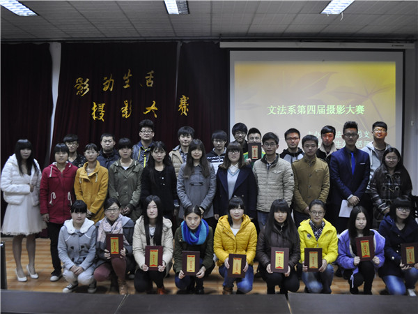 活动伊始,一段活力四射、动感潇洒的舞蹈拉开了此次大赛的序幕。随后,参赛选手结合作品进行了详细的解说,伴随着优美的语言、动人的述说,观众们进入了光与影、美与情的世界。有的选手以风景为主题,秋意浓浓的校园美景,娇艳欲滴的出水芙蓉,干净素雅的冬日雪景,清澈透明的西藏玉湖,美丽静谧的西塘古镇,水天一色的壮丽海景……一一呈现在观众面前。有的选手则以照片传达出的情感为切入点,朋友相见时温暖的微笑,家人相聚时感人的拥抱,师生交流时真诚的表情……也许不经意的一瞥,一个触动心灵的瞬间就被镜头定格成永远。夕阳西下,一对老夫妇手牵手走在悠静的小路上,对视时彼此关爱的眼神以及暖光下逐渐迷离的背影,将岁月中的相濡以沫、时光里的白头偕老通过照片完美地诠释出来。人来人往、喧嚣噪杂的人行道上,一位卖粽子的老大爷虽设备简陋、衣着朴素,但是脸上却一直洋溢着纯粹灿烂的笑容,让人不经意间被这知足乐观的微笑感动。其实,幸福就是来自内心的满足,幸福就是宁静生活中的美丽,幸福就是对别人和社会的感恩……“生活中不是缺少美,而是缺少发现美的眼睛”用镜头定格美丽、温暖、感动、爱……这也许就是摄影的魅力与价值、就是照片的灵魂和归属。最后经过公平公正的评审,来自行管14-1班的钱丽华脱颖而出摘得桂冠,法学14-2班和行管14-1班获得优秀组织奖。
