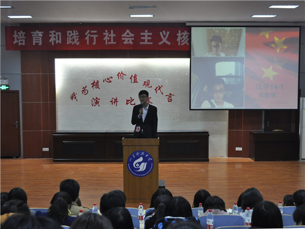 据了解,经过层层选拔,共有十位选手一路披荆斩棘闯入决赛。比赛过程中,参赛选手首先进行自我介绍,他们身着正装,面带笑容,精神饱满,洋溢着青春的气息和青年的朝气。随后,选手们以社会主义核心价值观为主题进行演讲,这一刻,他们在属于自己的舞台上慷慨激昂、神采飞扬,结合自己的亲身经历尽情畅谈了了对社会主义核心价值观的认识和理解,其内容丰富充实、角度新颖独特、思想积极向上,展示了深厚的演讲功底和独具特色的人格魅力。10号选手苏德增以《我对社会主义核心价值观的看法》为题,激情澎湃、斗志昂扬,详细论述了“诚信、友善”的含义、作用及意义,并向同学们提出“修身、齐家、治国、平天下”的积极号召,引起了同学们的强烈共鸣,掌声不断。随后,参赛选手随机抽取题目进行即兴演讲,虽然时间只有一分钟,但是选手们临危不乱、典故信手拈来、论述材料详实、表达自然流畅,充分表现出了良好的的临场应变能力、演讲口才实力和丰富的知识贮备。7号选手孙欣针对题目“我的梦,中国梦”,以英语名句入题,表述语言优美、表达顺畅流利,并和同学们积极互动,现场气氛活跃。本次比赛真可谓是精彩绝伦,赢得了评委老师的高度赞扬和观众们的满堂喝彩。最后,经过激烈角逐,来自法学14-1班的苏德增力压群雄夺得桂冠。