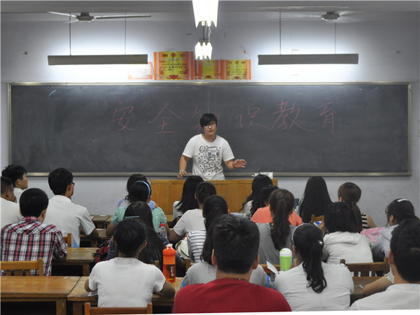 暑假期间,接连发生在四川、山东、浙江等地的几起女大学生被侵害的事件,引起了社会的广泛关注。为提高大学生的安全意识,增强自我保护能力。8月31日晚,由文法系团总支主办,自律会承办的安全知识教育活动在2014级新生自习室举行。