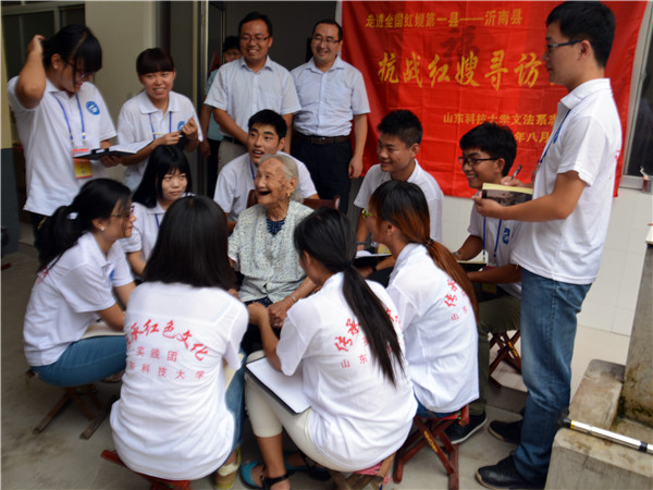 巍巍沂蒙山耸立起无私奉献的丰碑, 滔滔沂河水诉不尽沂蒙儿女对党的无限忠诚。临沂地区的队员郭超胜说:“作为年轻一代的大学生,我感到无比的自豪,因为大学生承担着建设社会主义和谐社会的光荣使命。而我作为实践团的一员,将在沂蒙精神的洗礼下,胸怀理想、做好自我、立足本职,有一分热,发一分光,对社会主义核心价值观也有了更深的认识。”(作者:唐信玲 摄影:宋宜萍)