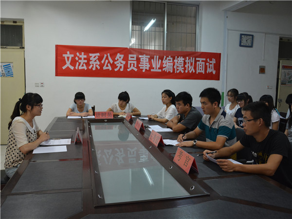 为了让同学们积累公务员面试经验,切实提高同学们的公务员、事业编等应试能力,让学生进一步明确努力方向,6月19日下午,由文法系团总支主办、系学生会外联部承办的公务员事业编模拟面试活动在系会议室成功举办。文法系主任张学银到现场对活动进行了有针对性的指导。