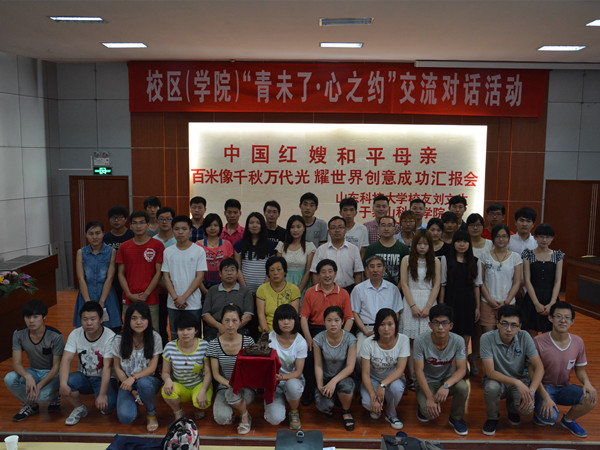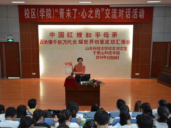 5月29日,由校区(学院)团委主办,文法系团总支承办的“中国红嫂和平母亲百米像千秋万代光耀世界创意成功”汇报会在西校园模拟法庭成功举行,本次活动也是一次对话交流活动。本次活动邀请的嘉宾是“中国将军艺术协会”与“中国红色文化促进会”副秘书长、山东科技大学老校友、沂南县山东沂蒙红嫂讲展馆馆长刘文生。文法系主任张学银、党总支副书记裴国栋等参与了交流活动。