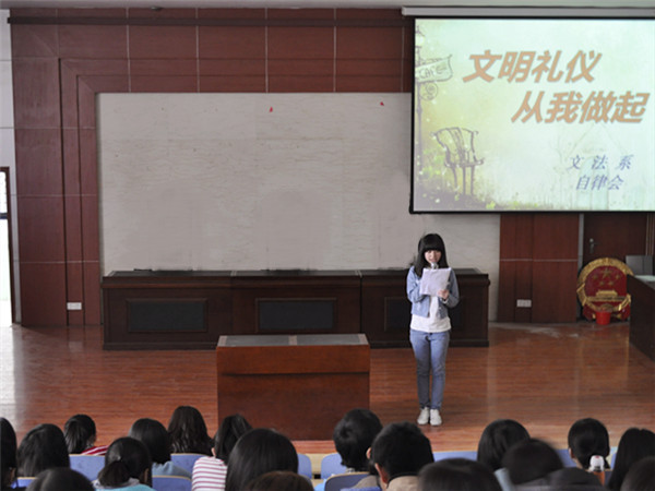 文明礼仪是一种修养,亦是一种信念。为积极贯彻校区(学院)“三风”建设,提高学生的文明素养, 4月2日下午,由文法系团总支主办、自律会纪检部和餐检部联合承办的“文明礼仪 从我做起”视频展活动在模拟法庭如期“上演”。